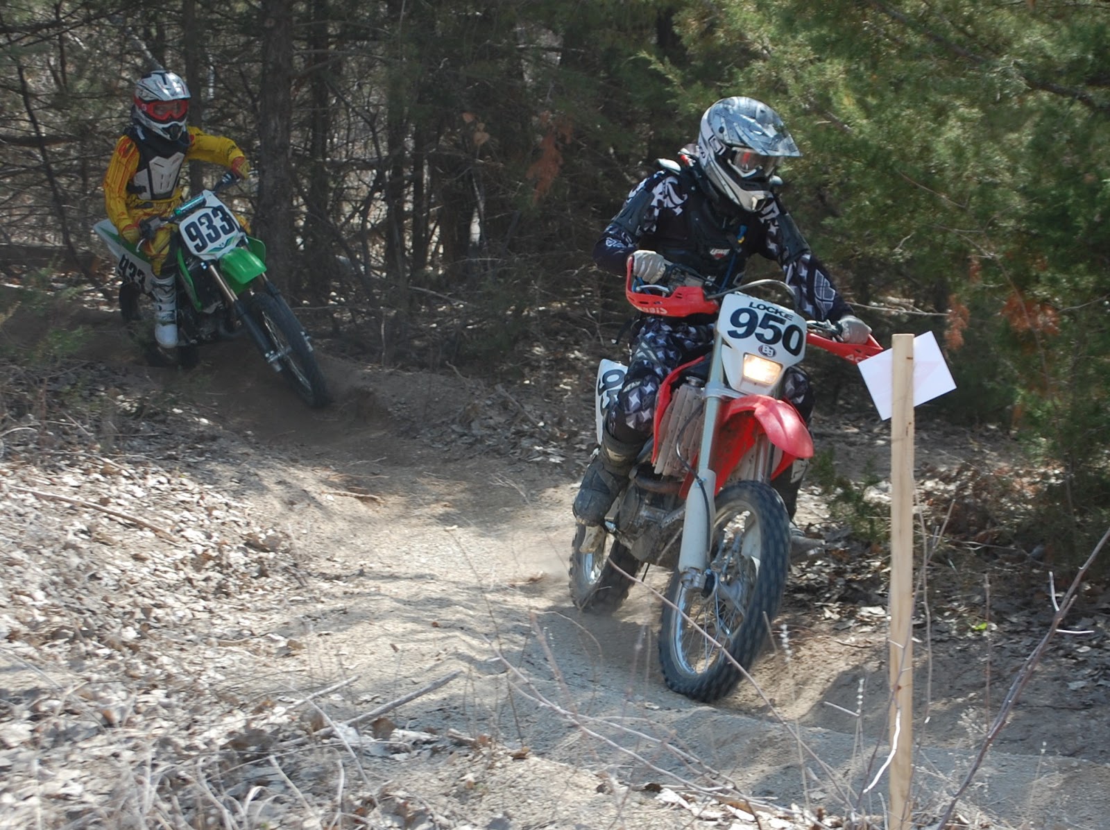 Just like any form of racing, starts are very critical in Hare Scrambles. Get behind 20 to 30+ guys and it can make for a long day in the saddle. It is especially more dangerous to be behind and have limited visibility when it is dusty. I wish I would have had more time to practice starts with Christopher. You can tell him all day long how to "get it done" but practice is what it takes. Today's start was on the beach which was a rocky shoreline. Keys to a good start besides getting that bike started are reaction time, throttle control, clutch control and commitment. On the left above is how it is done correctly. Yes, that me in the red at the top of the hill getting the holeshot clear of the dust and safely ahead of everyone. On the right above is Christopher (just in front on the guy on the KTM in the orange kit) not getting the holeshot and having to work his way through the 28 rider pack. To Christopher's credit he did just that and came around the first lap in 4th place. He is getting the speed but did he train enough during the off season and listen to his Dad? Read on for the answer.